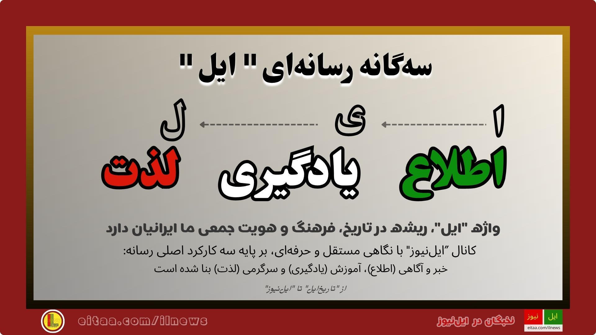 با بیان سیر "تاریخ ایل"، اکنون این سوال مطرح میشود که چگونه میتوان آن را به دنیای رسانهای و مدرن امروز مرتبط و وصل کرد؟ واژه "ایل" از سه حرف "الف"، "ی" و "ل"،تشکیل شده که مخفف سه کارکرد بنیادین رسانه در نظریه های کلاسیک است؛ اطلاع (خبر)، یادگیری (آموزش) و لذت (سرگرمی) و همین سهگانه، چارچوب "ایلنیوز" را تشکیل میدهند.